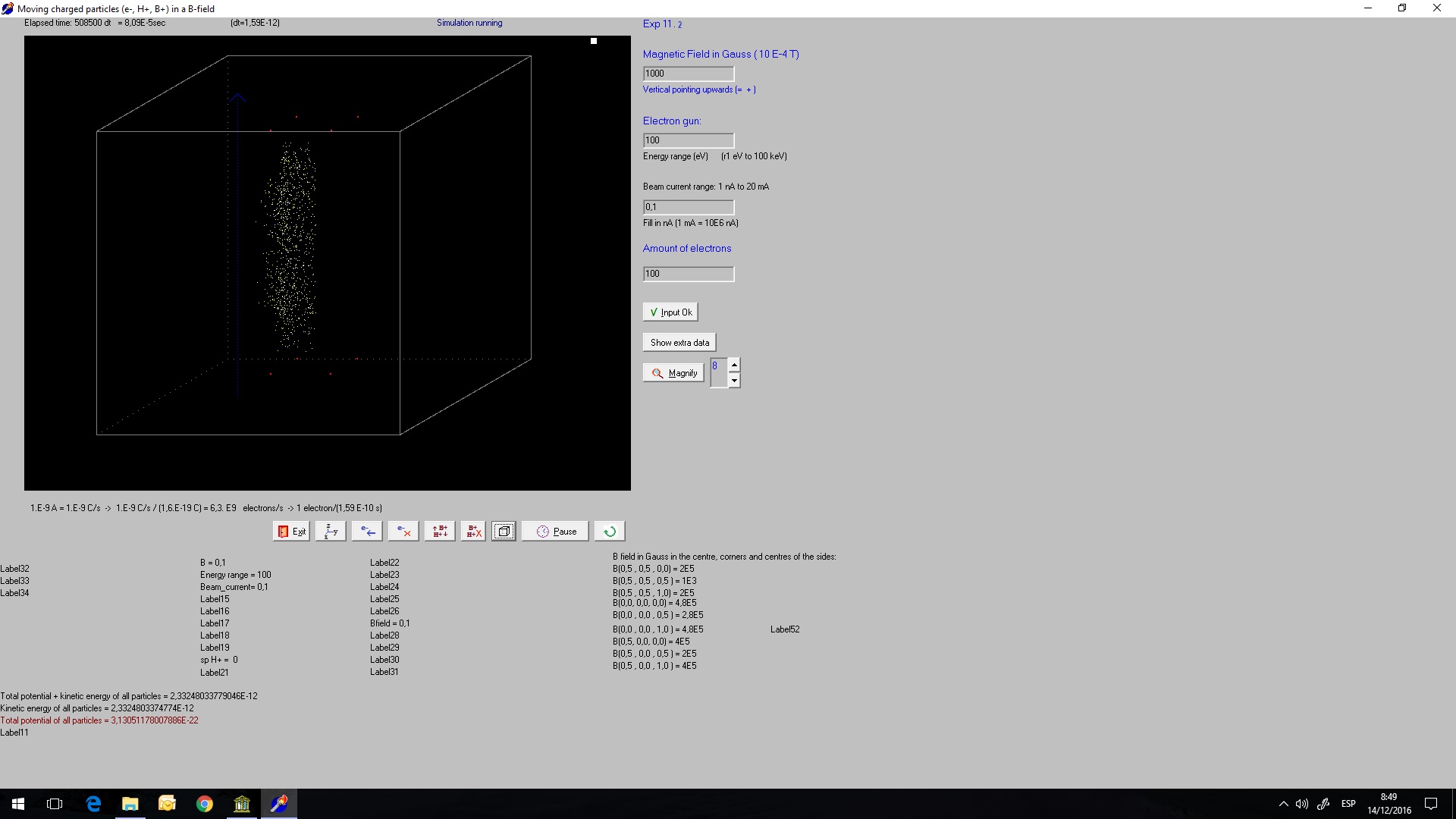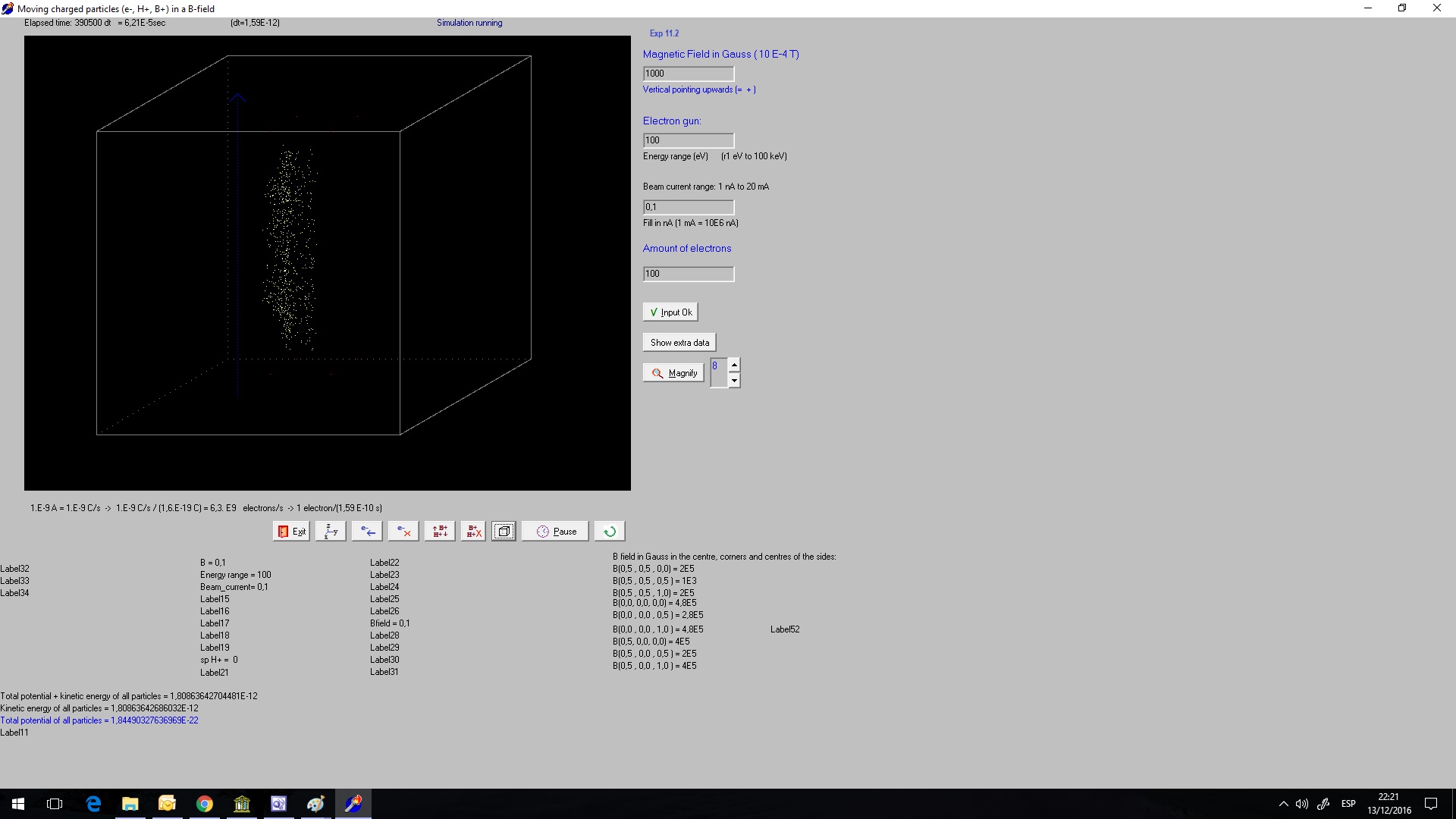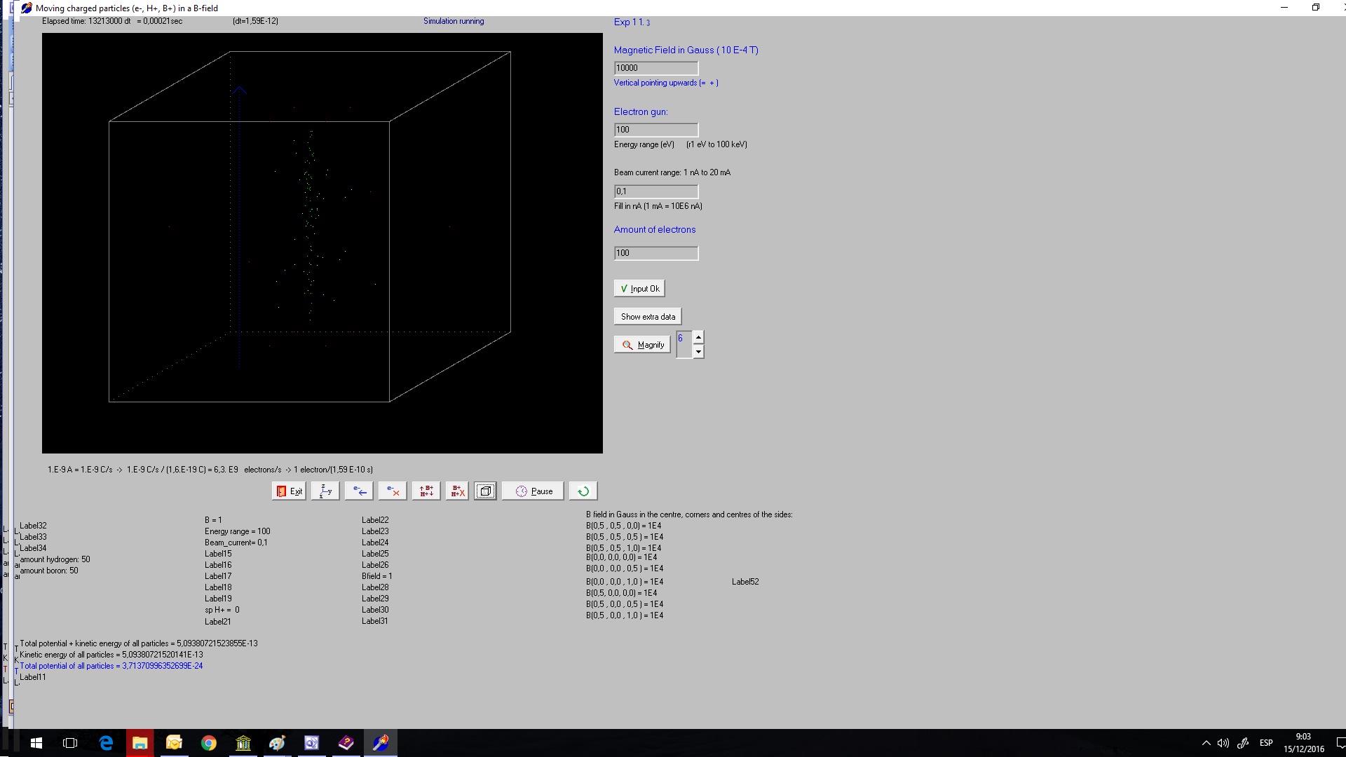 (if each point charge should be a sphere wit diameter 10 cm). Because there are now also fixed point charges, the potential energy of the moving particles relative to this point charges is also calculated. We started a experiment with 200 H+ and 200 B+ ions. Exp 11.6 screenshot 3.8 E-5 s B 1 T constant.jpg The total energy (= potential+kinetic energy)
