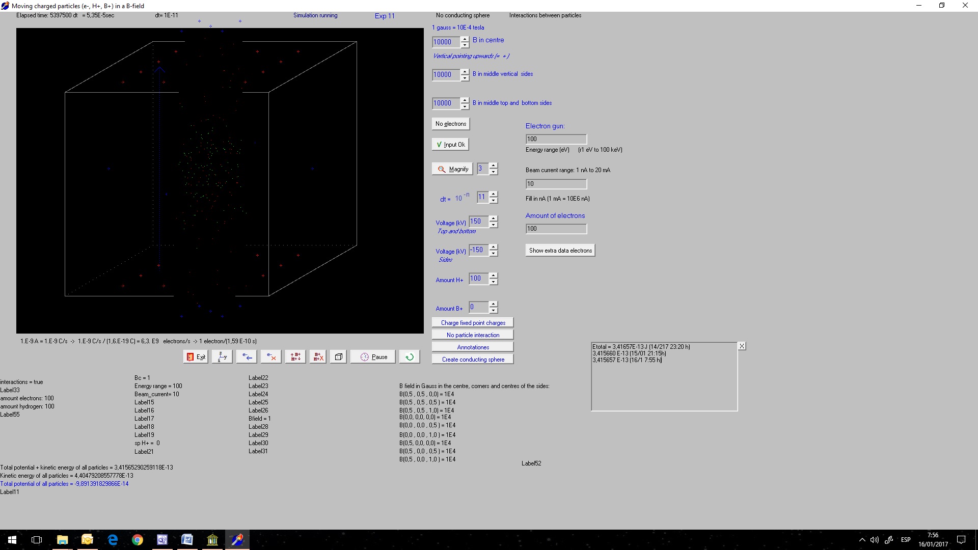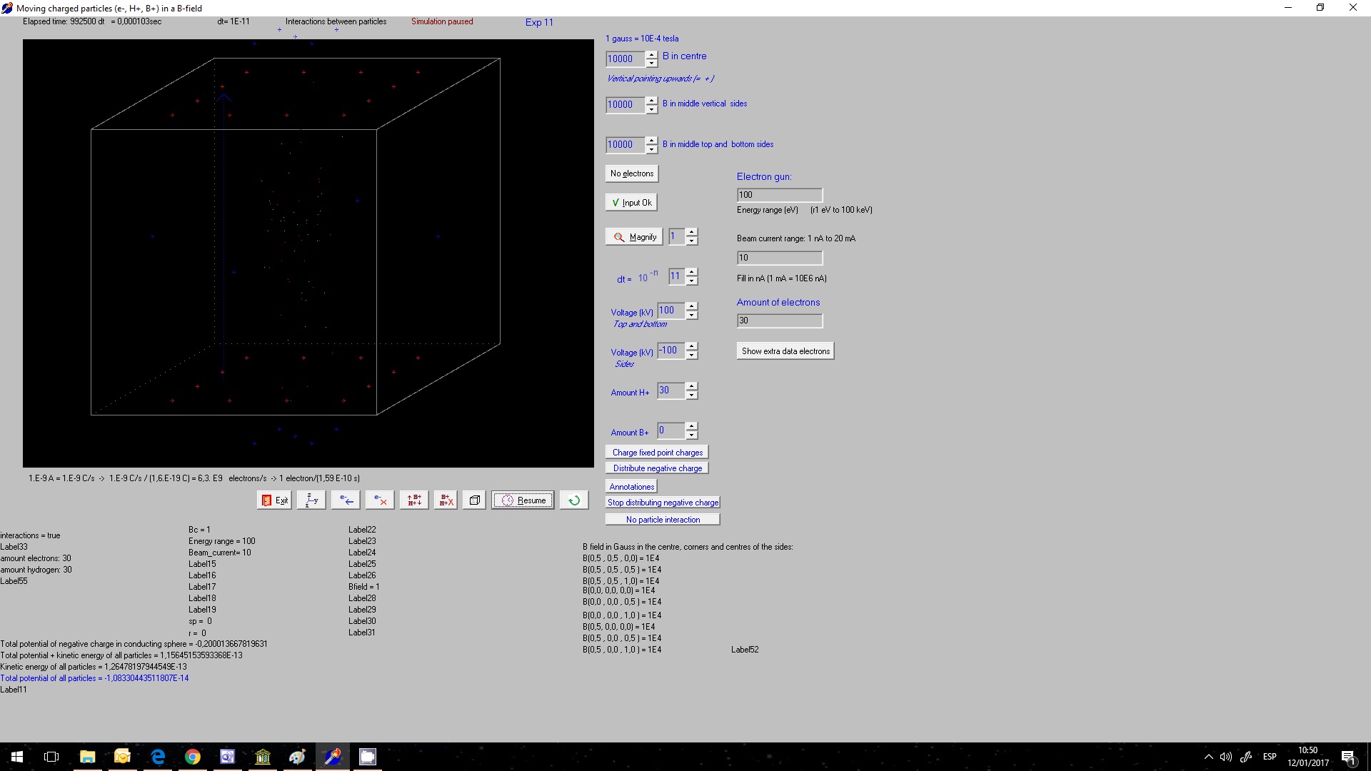 screenshot). In the bottom side the same ( here the negative point charges are situated 20 cm below the positive point charges, see screenshot) A point charge (blue colour) In the centre of each vertical side: In the program dt=1E-9 (to see the D+ ions move) and dt=1E-10 (to see the e- ions move, otherwise very fast) Bfield: 1 tesla (constant)
