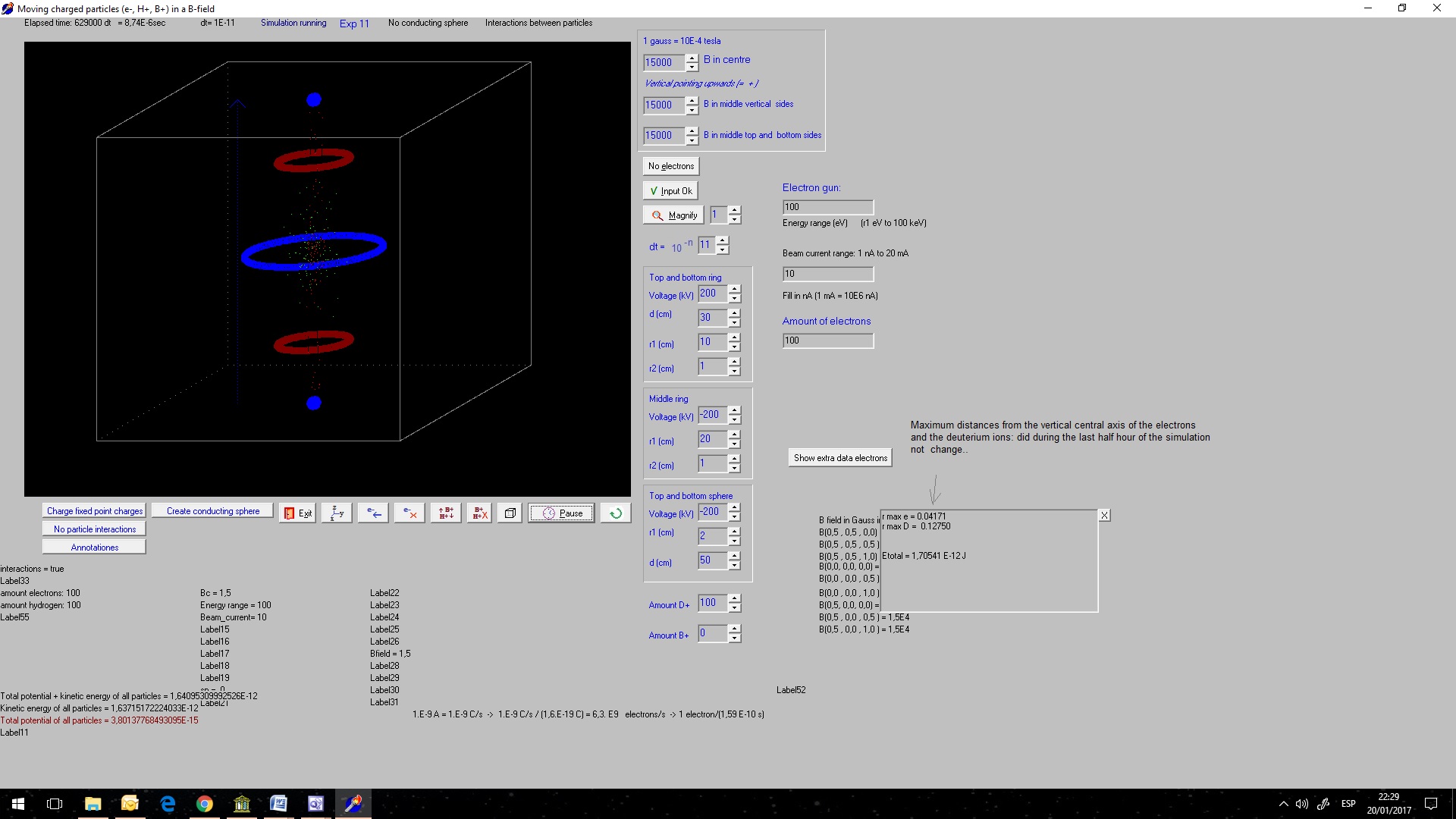 3E6 m/s} B-field = 1 tesla ( vertical) Voltages: +/- 100 kV Generated 5729 electrons and 20 D+. The program did not proceed anylonger because of too many particles.