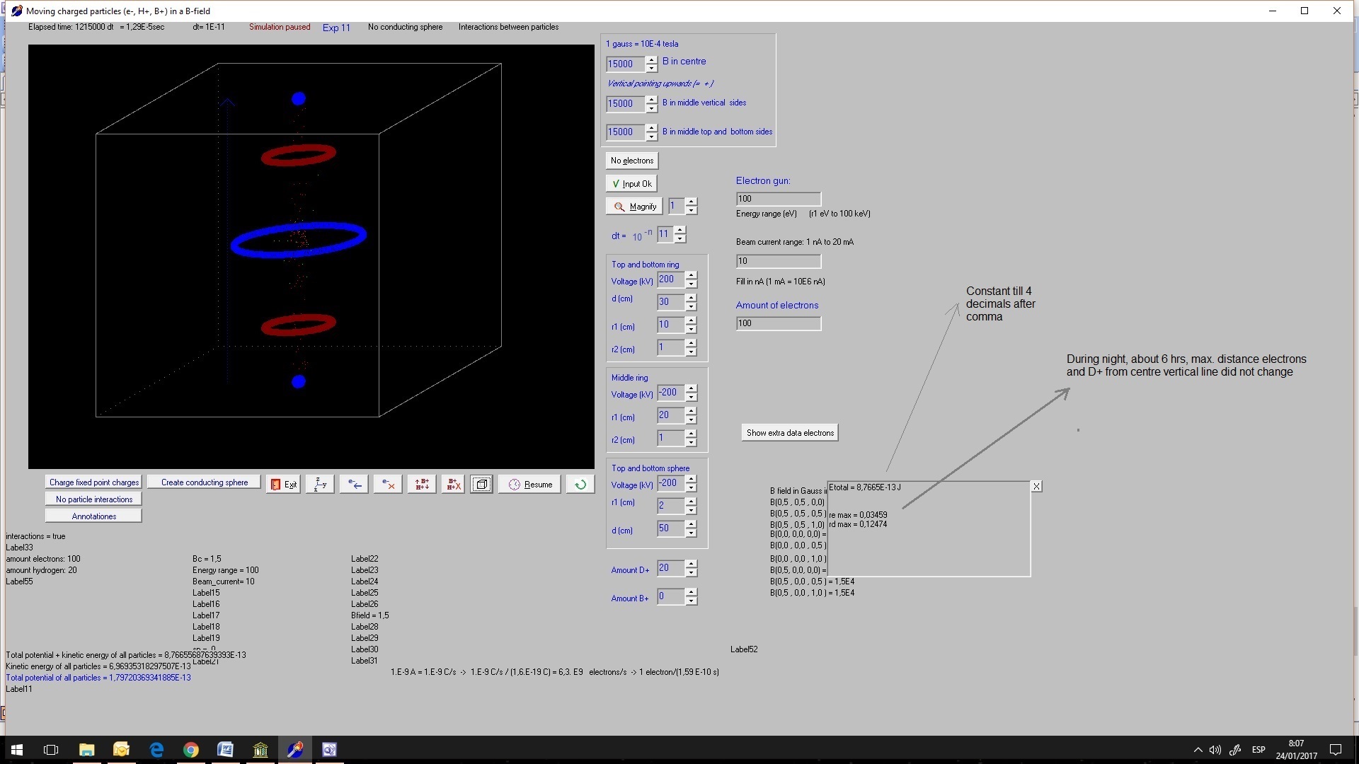 3E6 m/s} B-field = 1,5 tesla ( vertical) Program running about 48 hrs, with dt= 1E-11 and dt=1E-10 s.