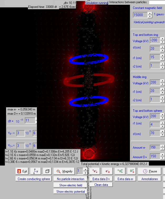 an electron). The charge of one red dot = 1E10 * -1,6E-19 C = -1,6E-9 C. During the short simulation time some electrons and deuterium ions escaped, but a great part of them stay confined. (I should have to add a procedure in the program that counts the amount of escaped particles..). To get an idea about the quantity of electrons generated: In the following link an electron gun is sold with an energy range: 1 eV to 100 keV and a beam current range: 1 nA to 20 mA kimballphysics.com/electron-gun-systems 1.10-9 A = 1.10-9 C/s ~ 1.10-9 C/s / (1,6.10-19 C) = 6,3. 109 electrons/s If the electrons would be generated with an electron gun that produces about 6,3. 109 electrons/ sec, we needed 200*1E10/(6,3. 109) = 317 s = 5,3 min