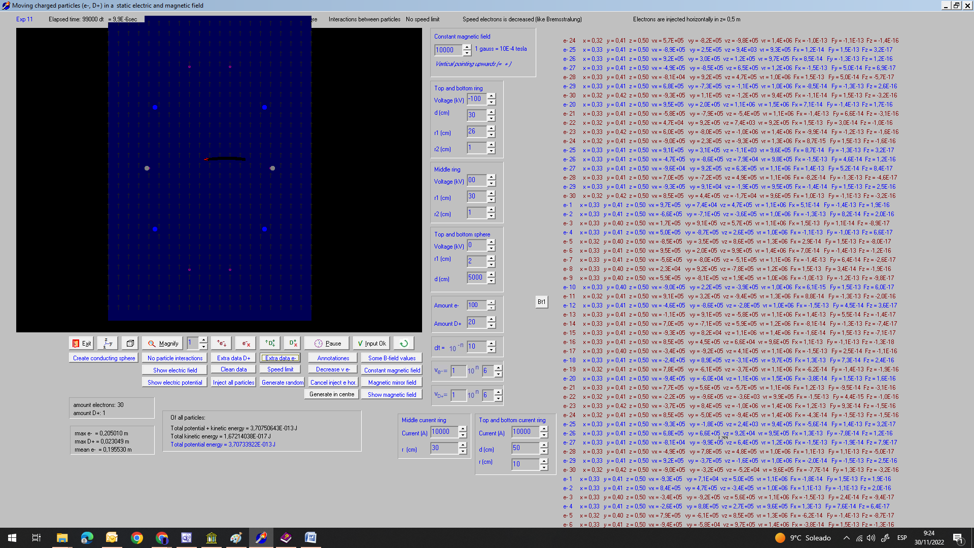 in time and they move then more to the outside. I saw one escaping. After 0,00018 s almost all electons escaped. And when their speed is small, they are not longer well confined by the magnetic field, It is a pitty that that they do not move to the centre, forming a kind of virtual electrode there :( I did the experiment with dt=1E-10 s, decreasing the speed of the electrons, and they did also escape. Fig. 13.