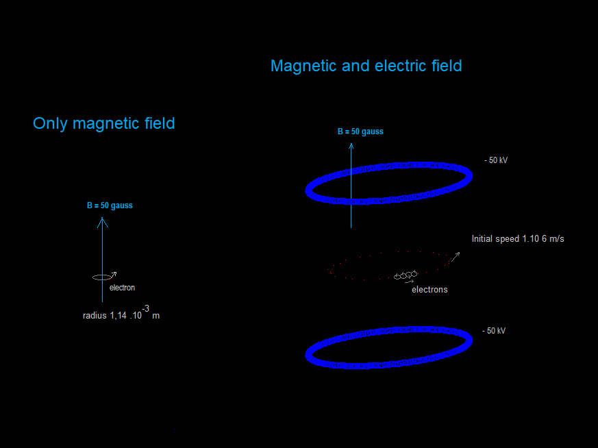 A vertical magnetic field of 50 gauss; the blue rings are charged with -50 kV. The behaviour of the electrons is quite curious: they move in a big circle (not necessarily an exact circle) with a radius of about 0,20 m, but also in small circles. The radius of the small circles (not necessarily exact circles) can hardly be seen. But the program has the possibiliy to magnify, and then it can be seen. I suppose that the radius of the small circles is (about): r = = m.v / ( B.q ) = 9.10 ×10−31 . (1,0.106) / (50.10-4 . 1.6021×10−19 ) = 1,14 .10-3 m But why they move in the big circle?